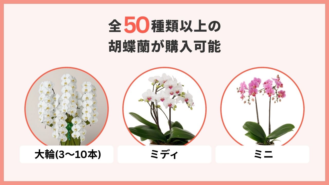 取扱商品 大輪胡蝶蘭、ミディ胡蝶蘭、ミニ胡蝶蘭