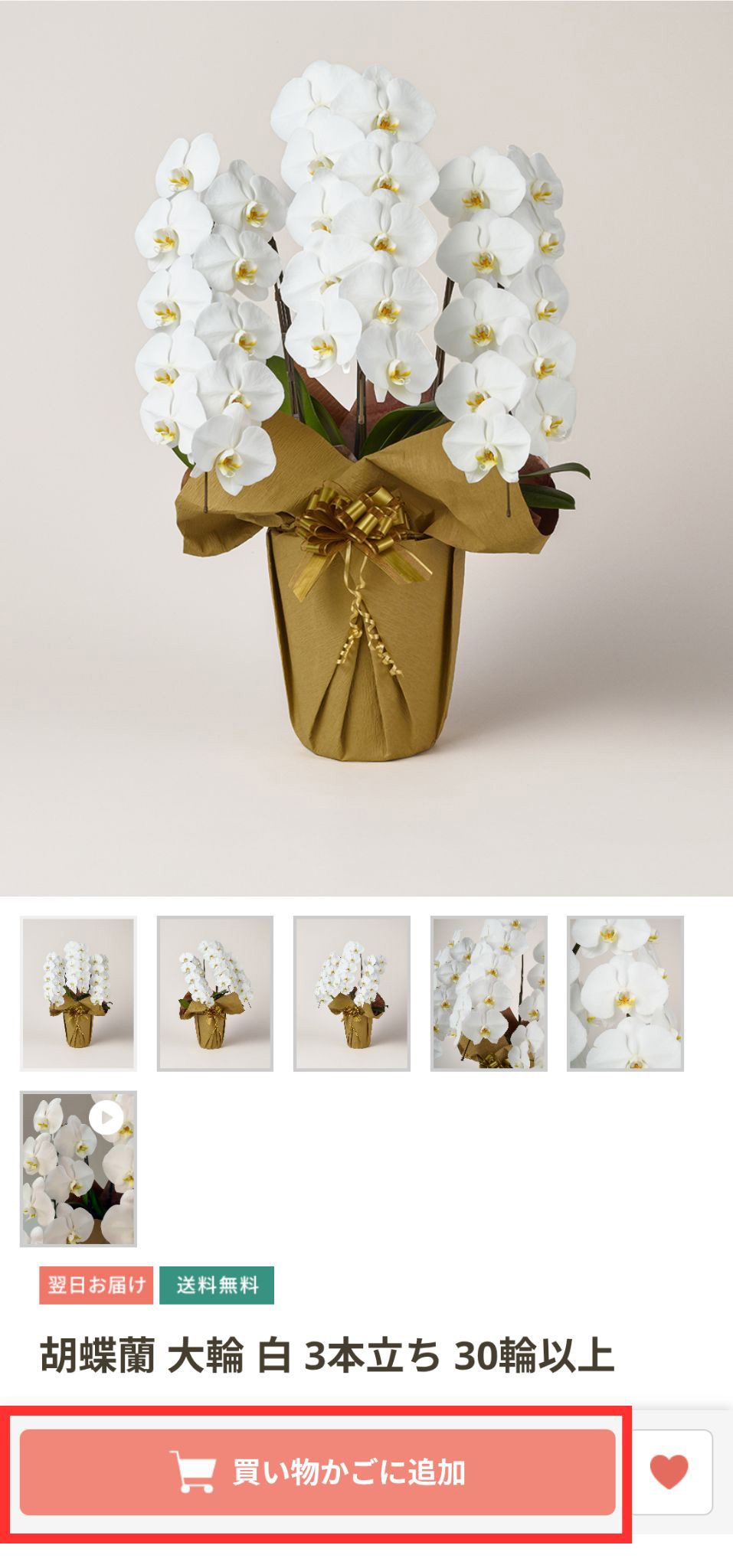 購入したい胡蝶蘭のページから「買い物かごに追加」をクリックする。
