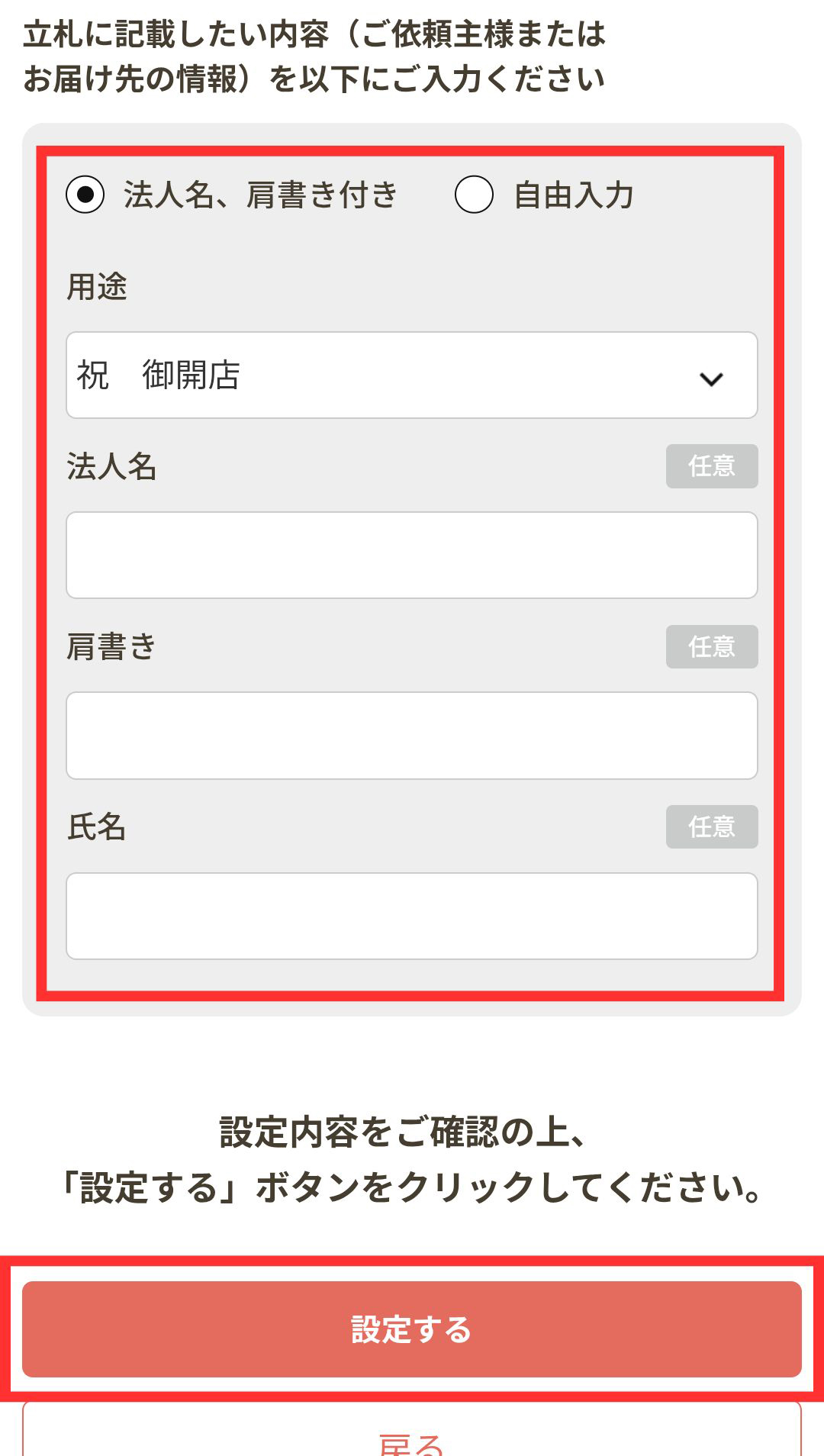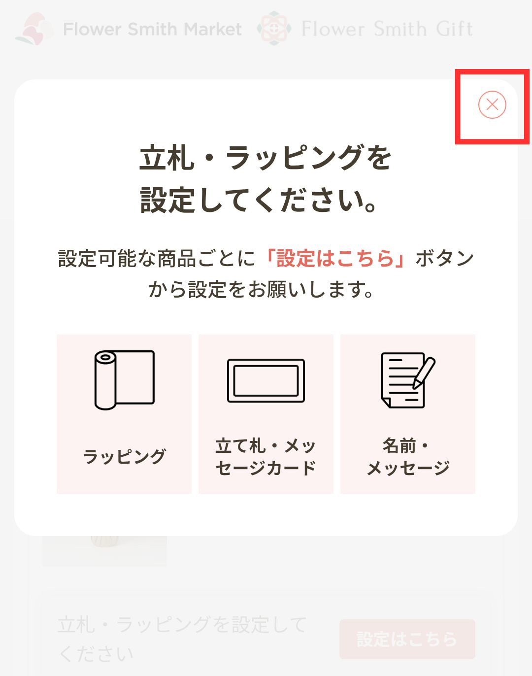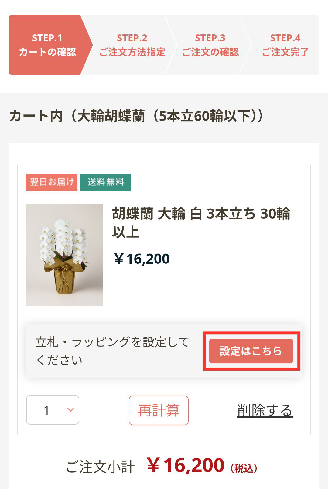 「設定はこちら」を押して、ラッピング・立て札の選択画面へ移動する