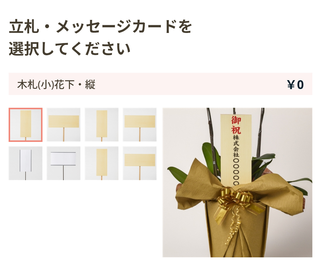 立て札(木札・紙札)、メッセージカード、ラッピング、発送前の写真送付サービス |