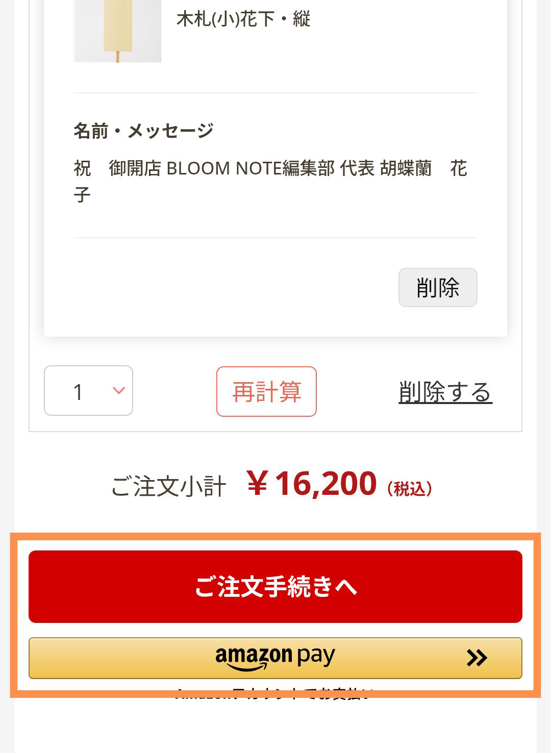 商品・ラッピング・立て札の内容に問題がないかを確認し、クレジットカード払いの場合は「ご注文手続きへ」、Amazon Pay支払いの場合は「amazon pay」のボタンをクリックする。