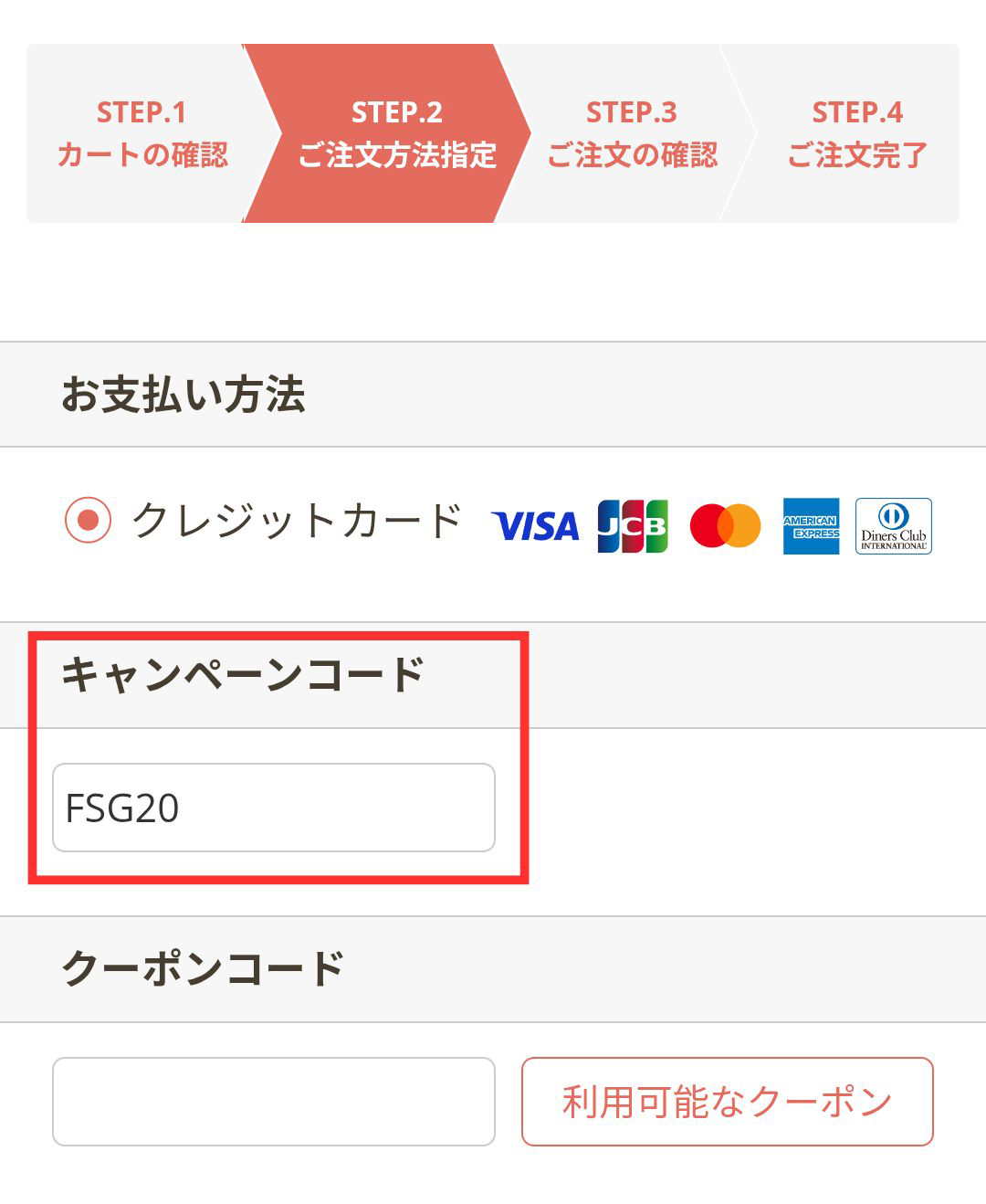 初回2,000円OFFを利用する場合は、この画面で「キャンペーンコード」欄に【FSG20】と入力する。