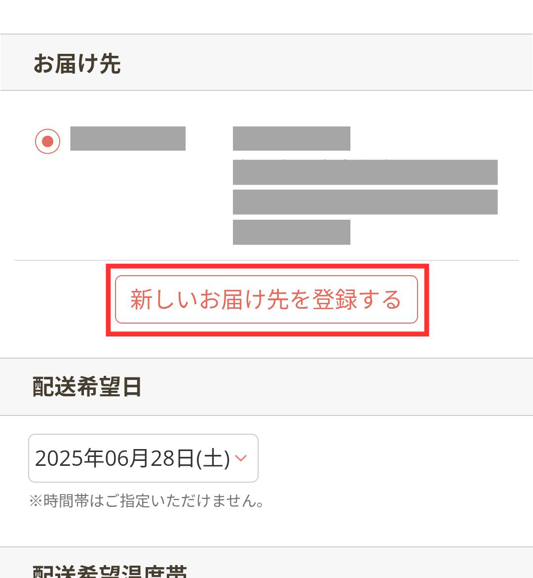 デフォルトでは会員として登録した住所が選択されているので、「新しいお届け先を登録する」をクリックして配送先を入力する。