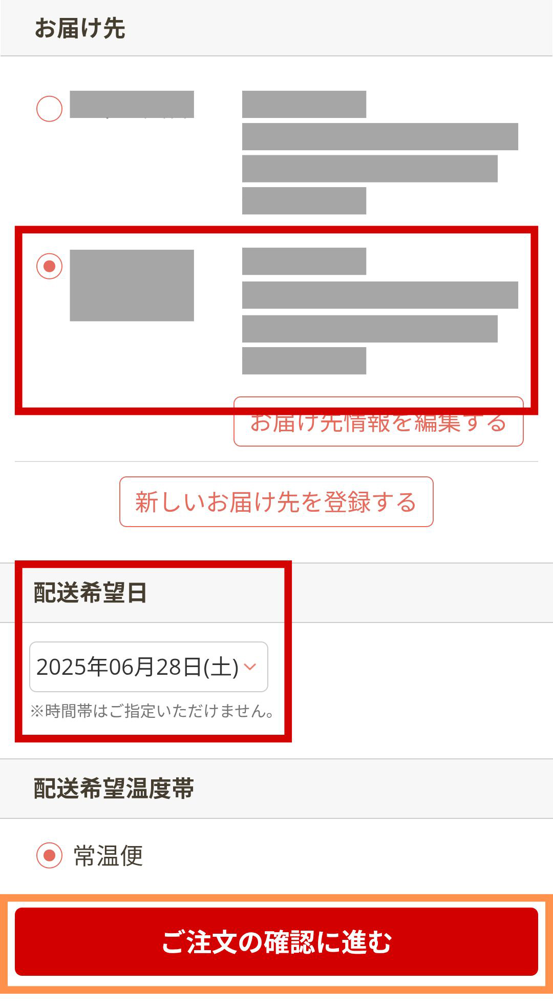 注文画面に戻るので、前の画面で登録したお届け先を選択する。